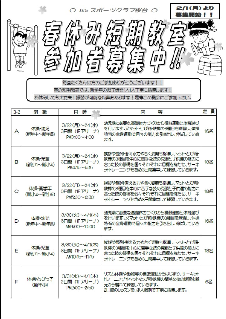 その他のお知らせ 2021春休み短期教室参加者募集中! 投稿者: itsgymnet on 2021年3月17日 2021春休み短期教室の募集を開始しています。 毎年人気の春休み短期教室にご参加ご希望の方は、お早めにお申し込み下さい。 詳細は下記のチラシをご覧下さい。 共有: クリックして X で共有 (新しいウィンドウで開きます) X Facebook で共有するにはクリックしてください (新しいウィンドウで開きます) Facebook クリックして印刷 (新しいウィンドウで開きます) 印刷 関連 カテゴリー:その他のお知らせ