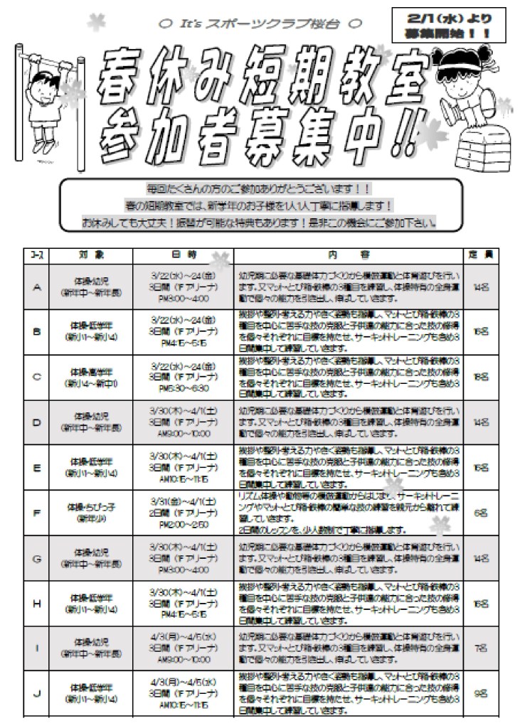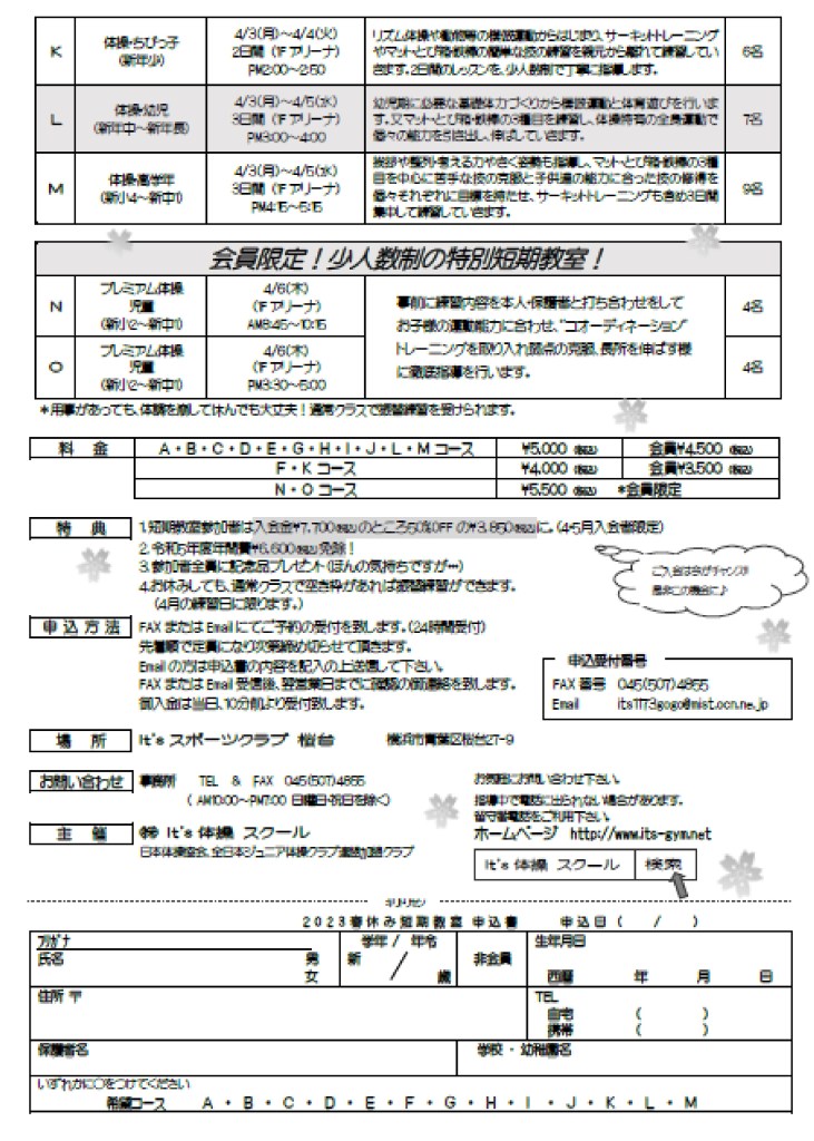 その他のお知らせ 2023春休み短期教室参加者募集中!! 投稿者: itsgymnet on 2023年2月1日 2023春休み短期教室参加者の募集を開始しています。 春休み短期教室にご参加をご希望の方は、お早めにお申し込み下さい。 詳細は下記のチラシをご覧下さい。 共有: クリックして X で共有 (新しいウィンドウで開きます) X Facebook で共有するにはクリックしてください (新しいウィンドウで開きます) Facebook クリックして印刷 (新しいウィンドウで開きます) 印刷 関連 カテゴリー:その他のお知らせ