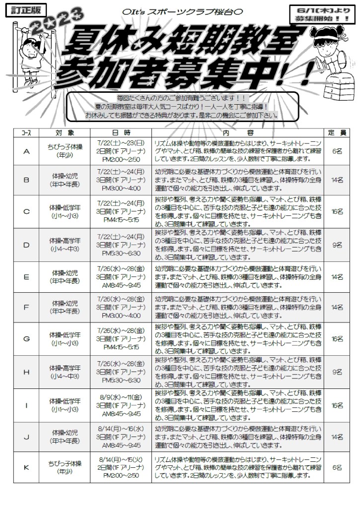 その他のお知らせ 2023夏休み短期教室参加者募集中!! 投稿者: itsgymnet on 2023年5月30日 2023夏休み短期教室参加者の募集を6/1(木)から開始します。 夏休み短期教室にご参加をご希望の方は、お早めにお申し込み下さい。 詳細は下記のチラシをご覧下さい。 ※一部地域で配布したチラシに訂正があります。 誤)Dコース7/22(金)~24(日) ⇒ 正)Dコース7/22(土)~24(月) 現在、掲載している情報が正しいものになりますので、ご確認下さい。 共有: X で共有 (新しいウィンドウで開きます) X Facebook で共有 (新しいウィンドウで開きます) Facebook 印刷 (新しいウィンドウで開きます) 印刷 関連 カテゴリー:その他のお知らせ