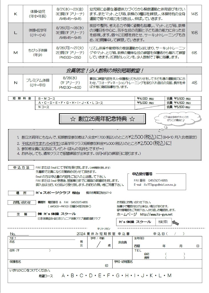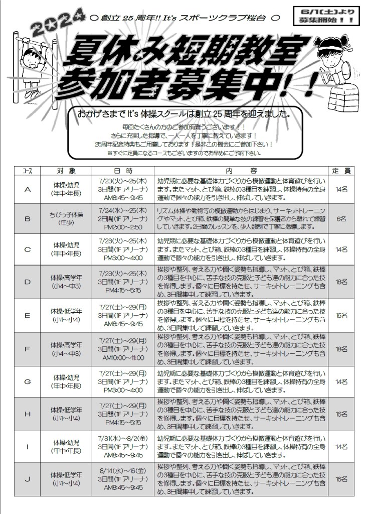 その他のお知らせ 2024夏休み短期教室参加者募集中!! 投稿者: itsgymnet on 2024年6月1日 2024夏休み短期教室の募集を開始しています。 夏休み短期教室にご参加をご希望の方は、お早めにお申し込み下さい。 創立25周年記念特典もございますので、 詳細は下記のチラシをご覧下さい。 共有: クリックして X で共有 (新しいウィンドウで開きます) X Facebook で共有するにはクリックしてください (新しいウィンドウで開きます) Facebook クリックして印刷 (新しいウィンドウで開きます) 印刷 関連 カテゴリー:その他のお知らせ
