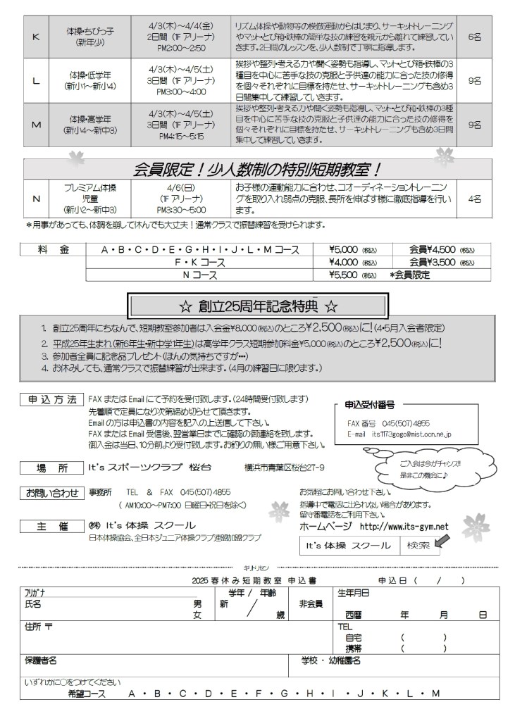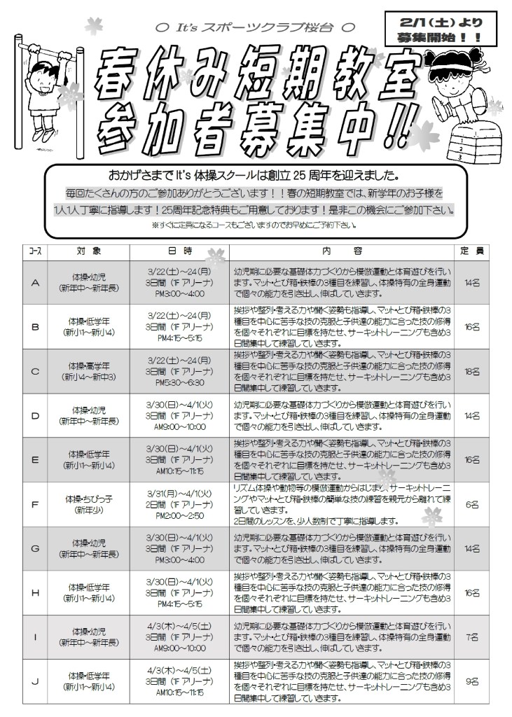 その他のお知らせ 2025春休み短期教室参加者募集中!! 投稿者: itsgymnet on 2025年1月29日 2025春休み短期教室の募集を開始しています。 春休み短期教室にご参加をご希望の方は、お早めにお申し込み下さい。 創立25周年記念特典もございますので、 詳細は下記のチラシをご覧下さい。 共有: クリックして X で共有 (新しいウィンドウで開きます) X Facebook で共有するにはクリックしてください (新しいウィンドウで開きます) Facebook クリックして印刷 (新しいウィンドウで開きます) 印刷 関連 カテゴリー:その他のお知らせ