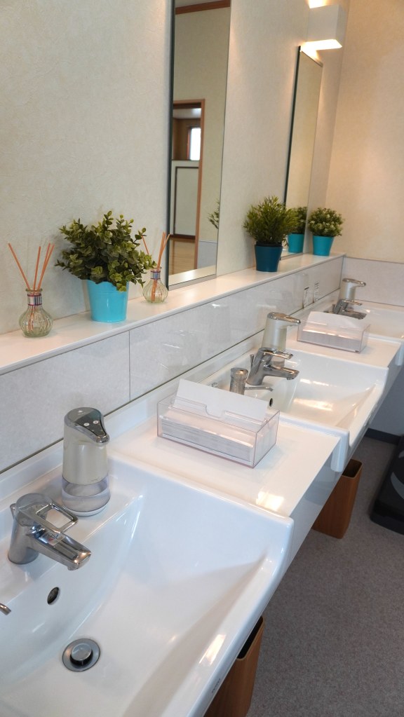 洗面台には一つずつアルコール手指消毒ディスペンサーを設置